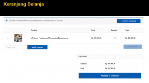 Anda kemudian akan diarahkan ke halaman Keranjang Belanja. Di halaman ini, Anda bisa mengklik tombol “Continue Shopping” bila Anda ingin memilih topik eTraining lainnya.